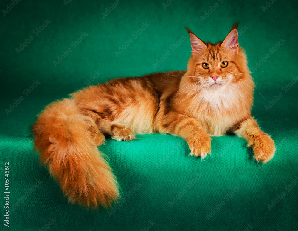 Portrait Of Red Maine Coon Cat On Green Background Stock Photo Adobe Stock